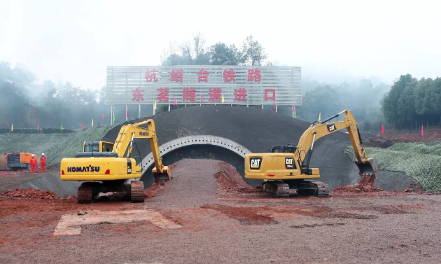 推進會之后,杭紹臺鐵路新嵊段在東茗隧道進口處正式破土施工。據悉,椒江特大橋也同步開工,這標志著杭紹臺高鐵正式進入全線施工階段。