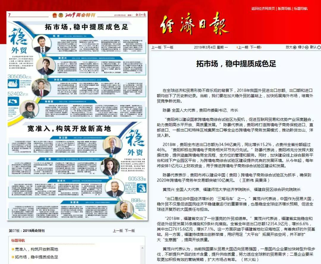 3月4日,經(jīng)濟日報刊登了《拓市場,穩(wěn)中提質(zhì)成色足》兩會專題報道,陳愛蓮代表與代表委員們圍繞“穩(wěn)外貿(mào)”展開熱烈討論。