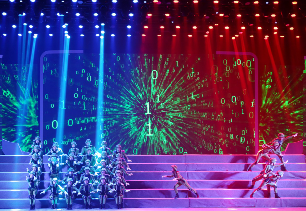 歌舞《決勝千里》在有限的空間里,以精湛的表演和華麗的特效表現(xiàn)了海陸空全方位“決勝”,奪人眼球,動人心弦。