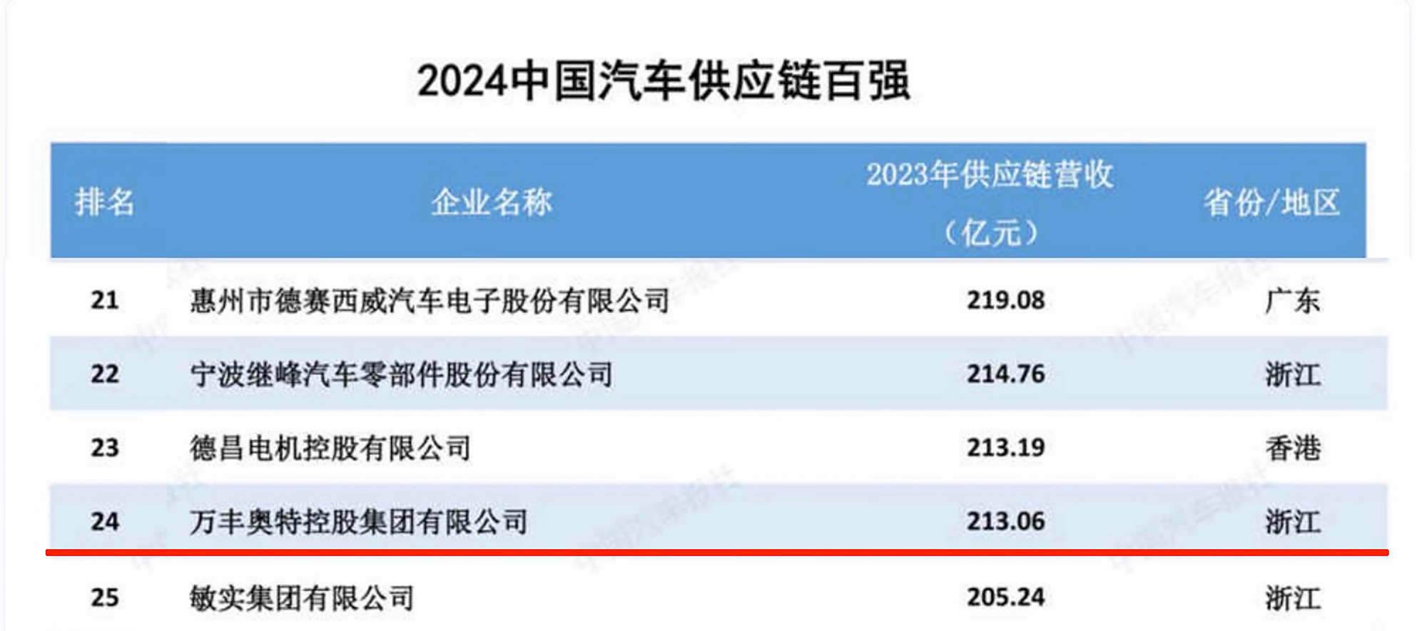 8月22日,由《中國汽車報》社和羅蘭貝格聯合編制的《2024全球汽車供應鏈核心企業競爭力白皮書》正式發布,揭曉了2024中國汽車供應鏈百強榜單,萬豐奧特控股集團位列第24位。