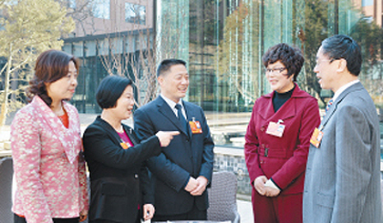 3月4日下午,出席十二屆全國(guó)人大一次會(huì)議的全國(guó)人大代表錢建民、車曉端、葉飛帆、陳愛(ài)蓮和徐愛(ài)華,在浙江代表團(tuán)駐地商議如何認(rèn)真履行職責(zé)、開(kāi)好這次大會(huì),表示要仔細(xì)審議各項(xiàng)報(bào)告、積極建言獻(xiàn)策、如實(shí)反映群眾的意見(jiàn)和建議等。 (特派記者 袁云 發(fā)自北京)