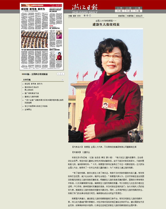 【浙江日報】全國人大代表陳愛蓮:建新生兒指紋檔案
